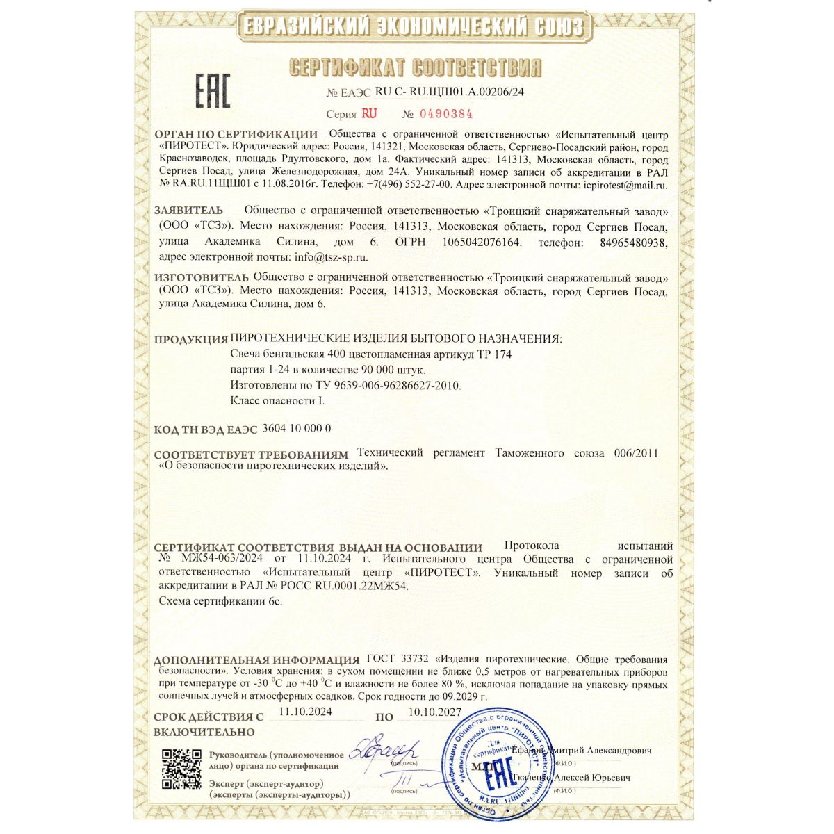 Большие бенгальские огни имеют Сертификат соответствия качества ЕАС