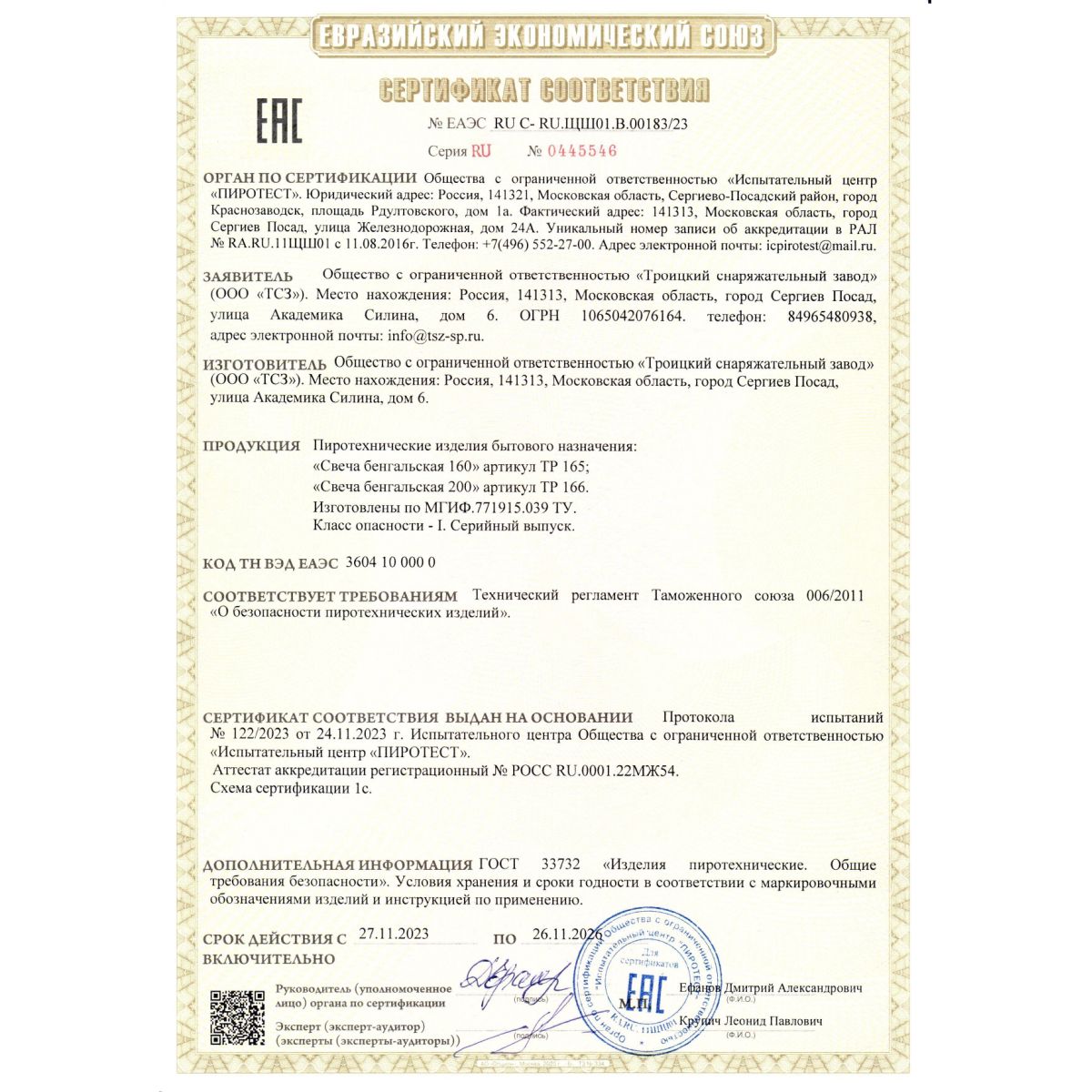 Бенгальские огни имеют Сертификат соответствия качества ЕАС